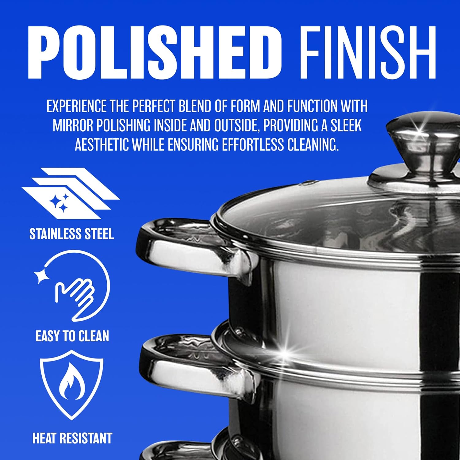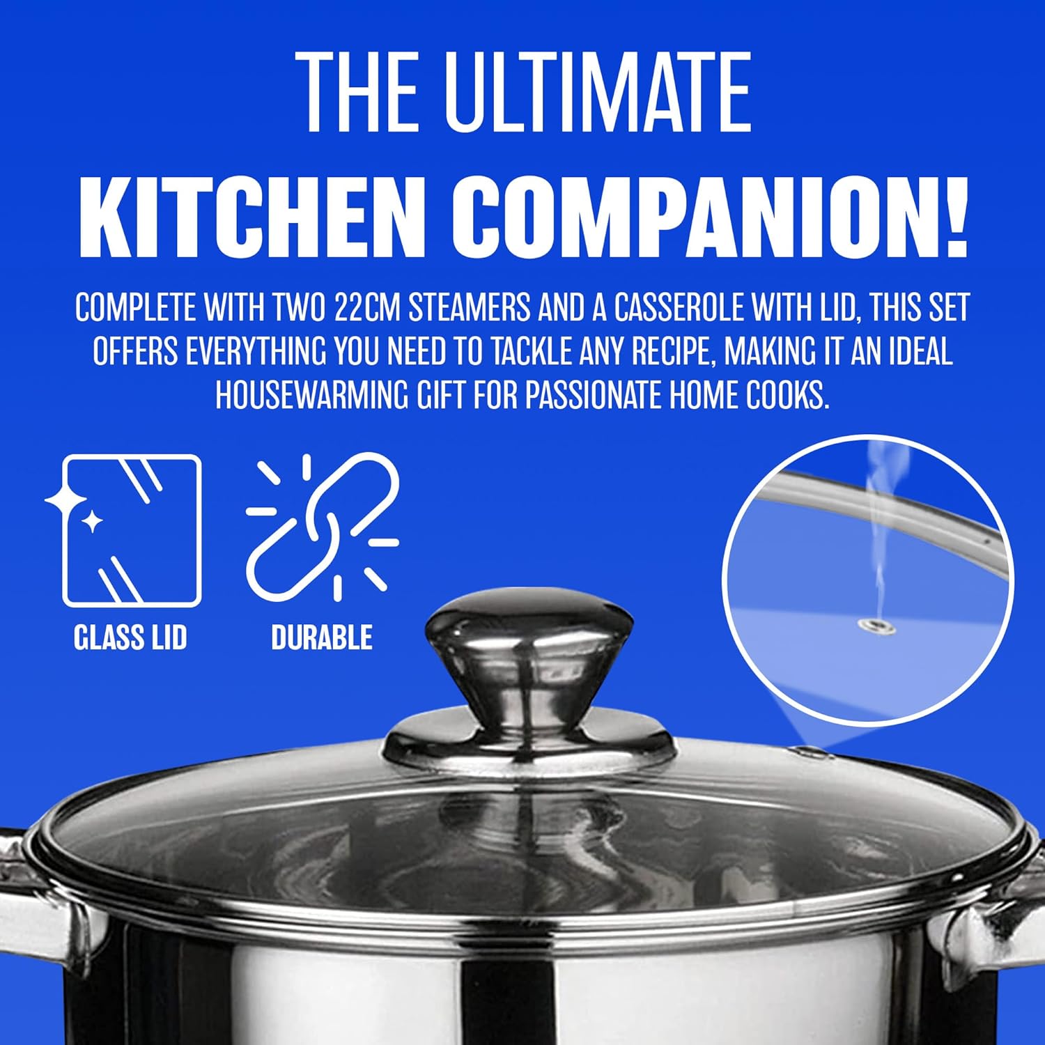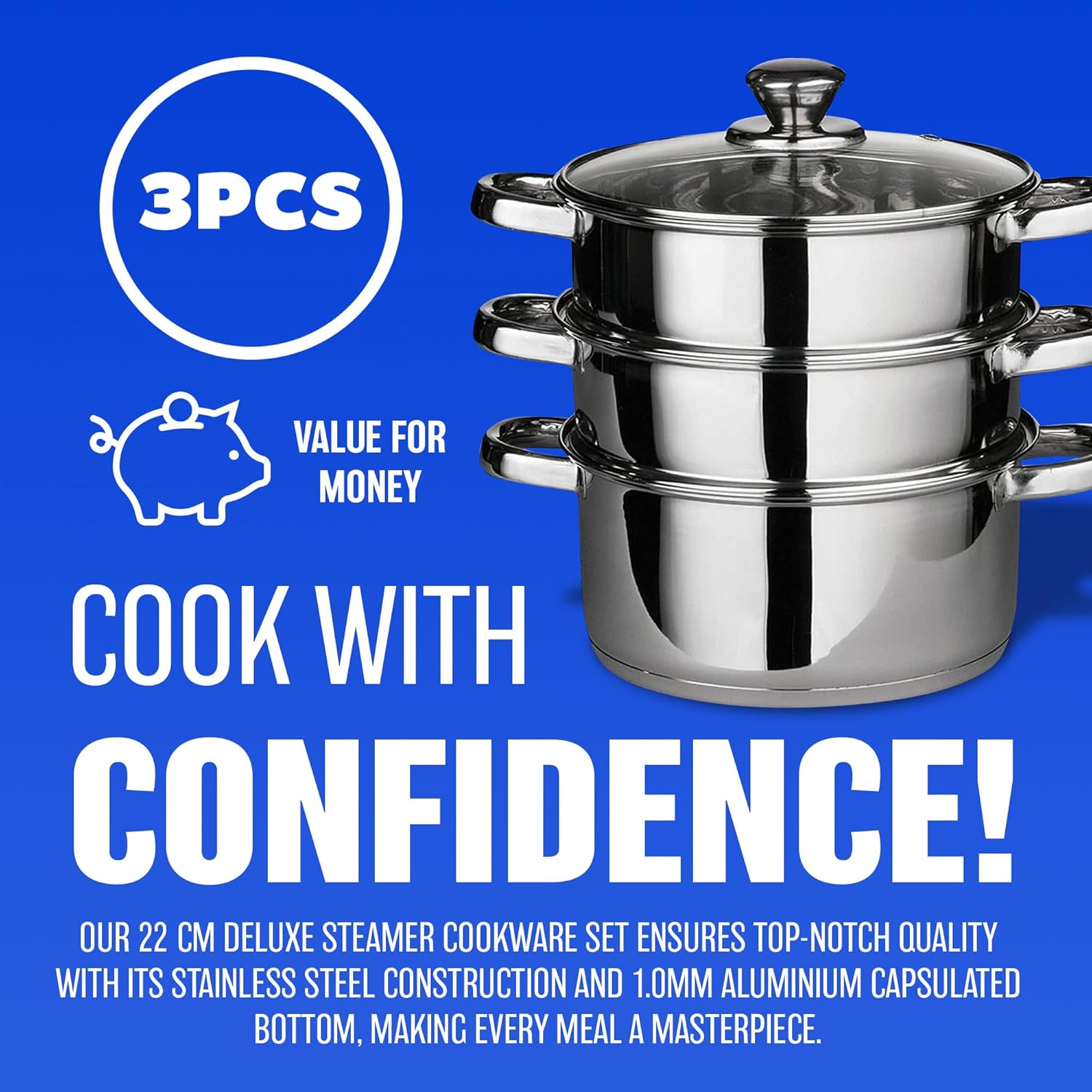 22 CM DELUXE STEAMER COOKWARE SET - WITH GLASS LID & HANDLES | STAINLESS STEEL PAN, 3 TIER POT CAPSULATED BOTTOM, KITCHEN HOME COOKING PANS, CHEF HEALTHY VEG COOK, MULTI PURPOSE