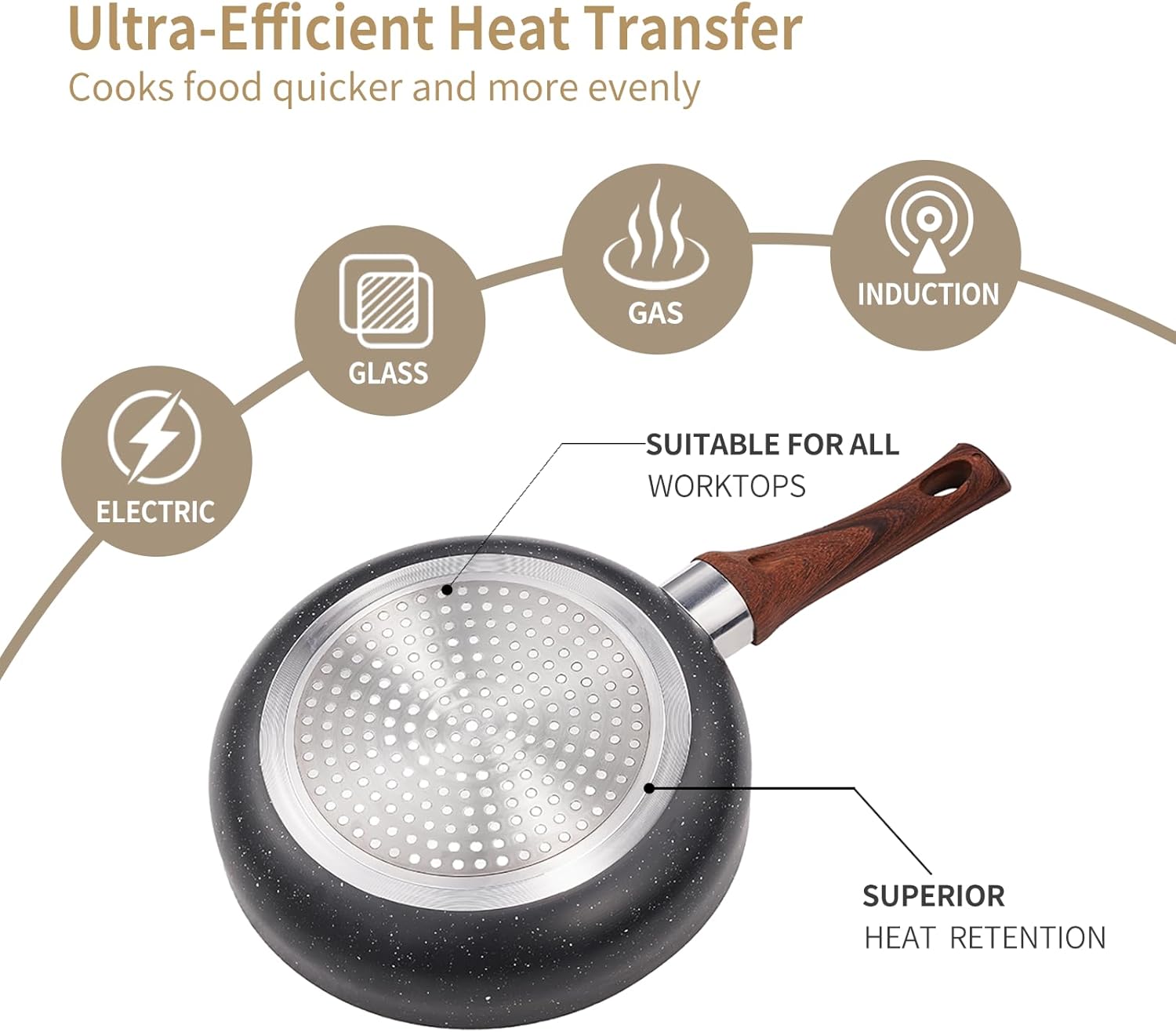 Enjoy healthier meals with our durable marble-effect non-stick coating, designed for effortless food release and scratch resistance. Cook with less oil and achieve perfect results every time. The induction-compatible base ensures even heat distribution across all hob types, including gas, electric, ceramic, and induction. Built to perform and last, this cookware set delivers versatility for every kitchen.